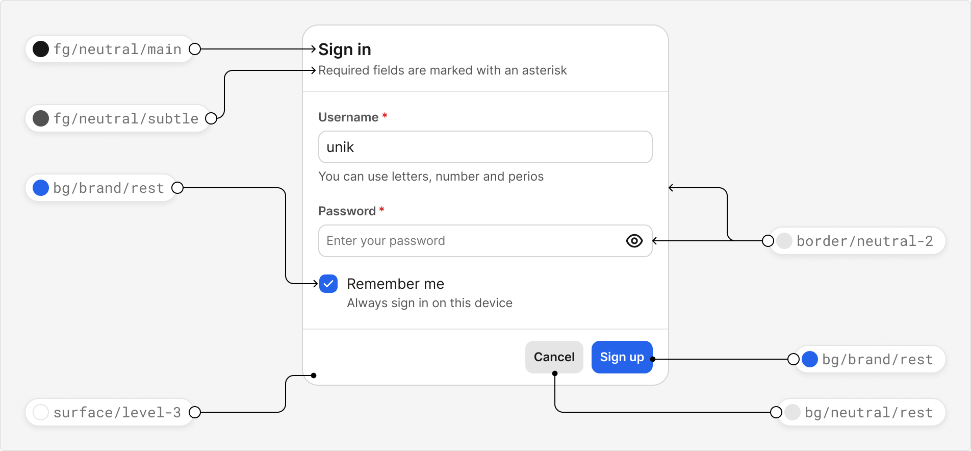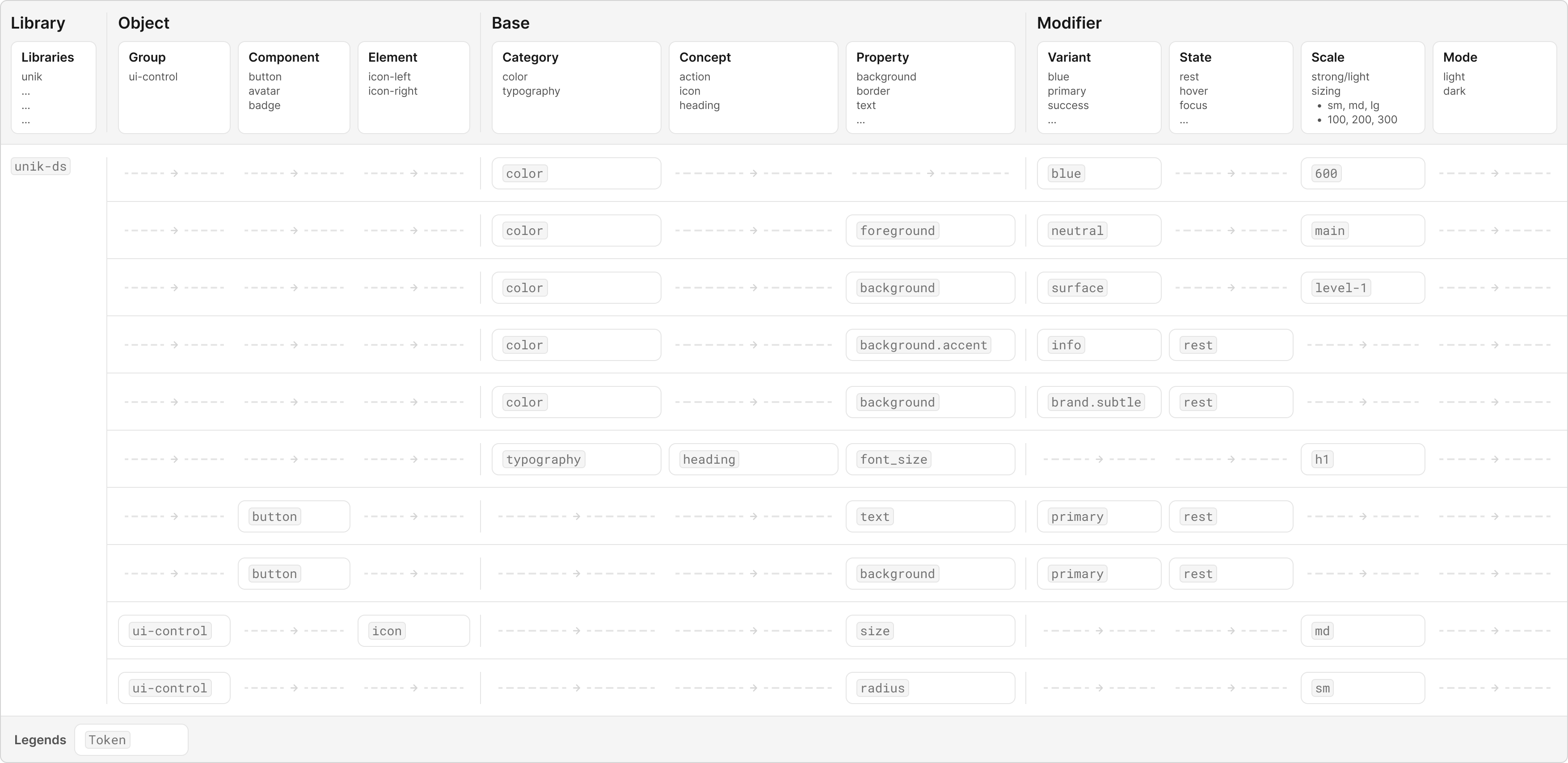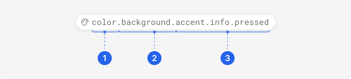 Modifier: Additional details about the token’s purpose, such as its color role, emphasis, or interaction state.