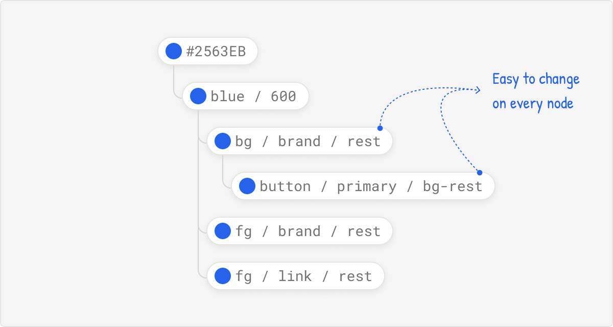Design tokens organized in a tree structure allow for easy modifications at any level of the hierarchy. This means that if a design system builder needs to change a specific node such as a color, font size, or spacing value. They can do so without affecting unrelated parts of the system.