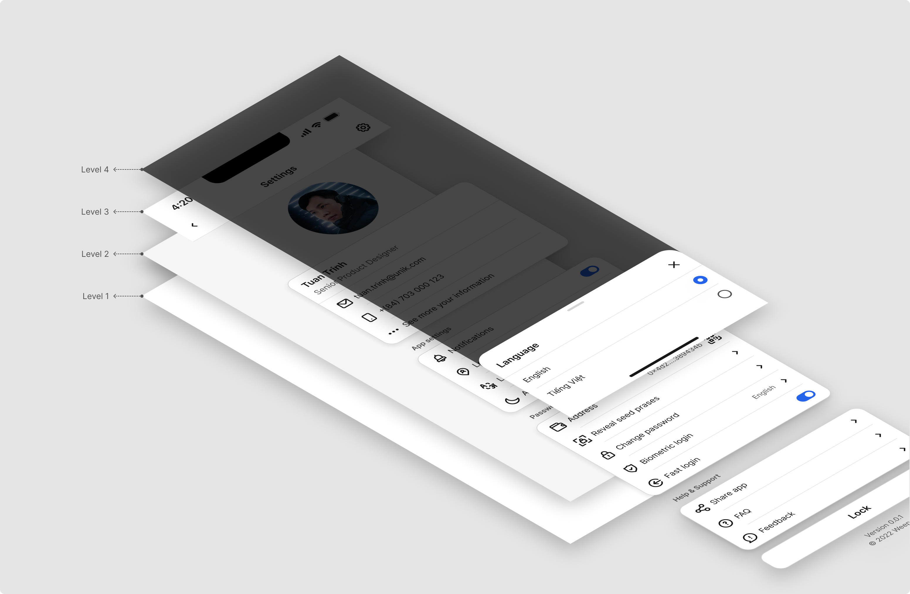 Surface is important in User Interface because it defines the visual layers, depth, and hierarchy of the elements in the interface, influencing how users perceive and interact with the content. Below is each layer that I defined