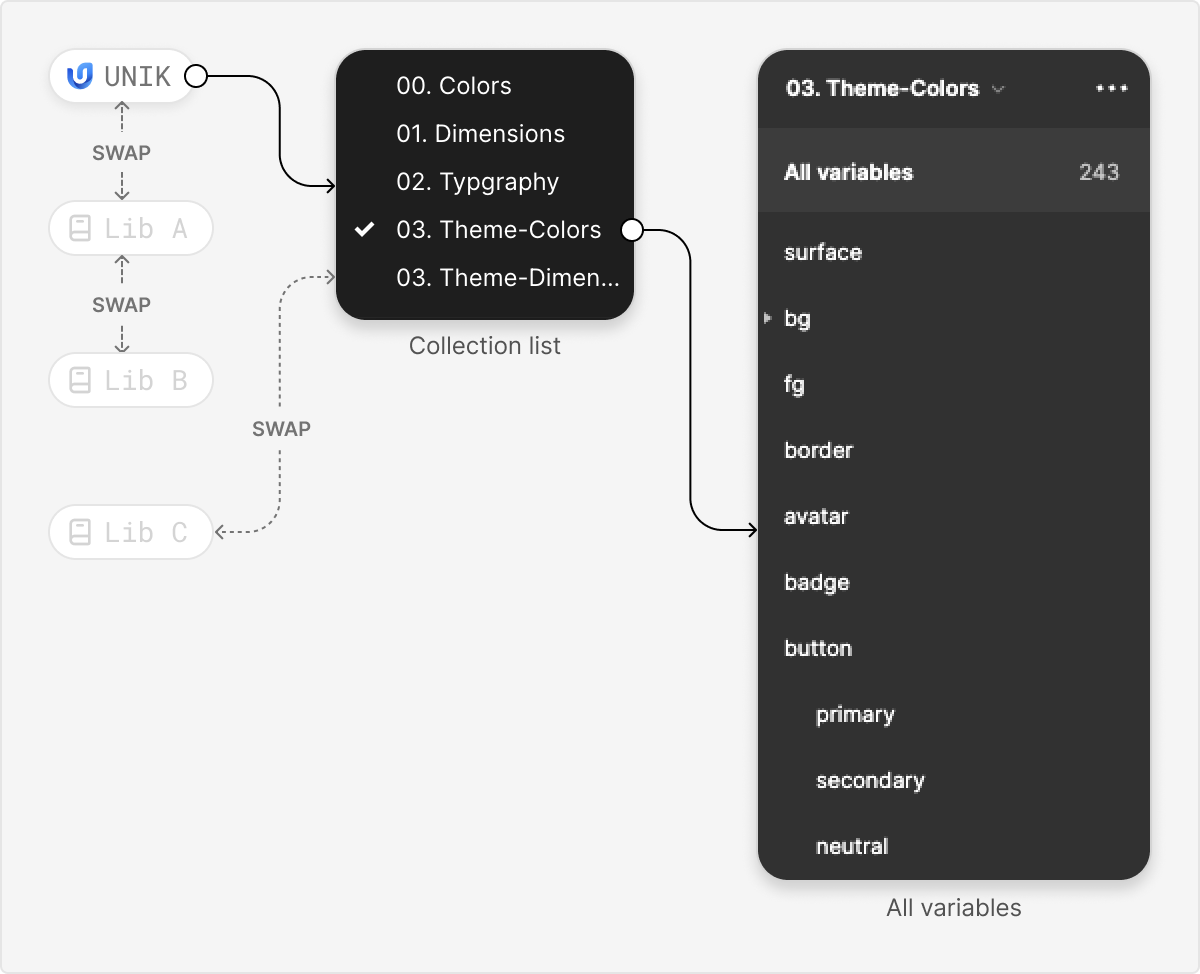 Easy to distribute many themes (Dark/Light) or switch to other libraries (Unik, SaleForce,…)