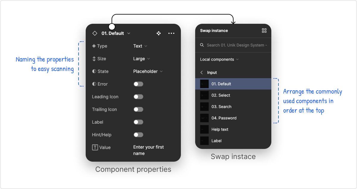 Leverage the properties feature of Figma to speed up the design workflow. Also, it reduces component creation.
