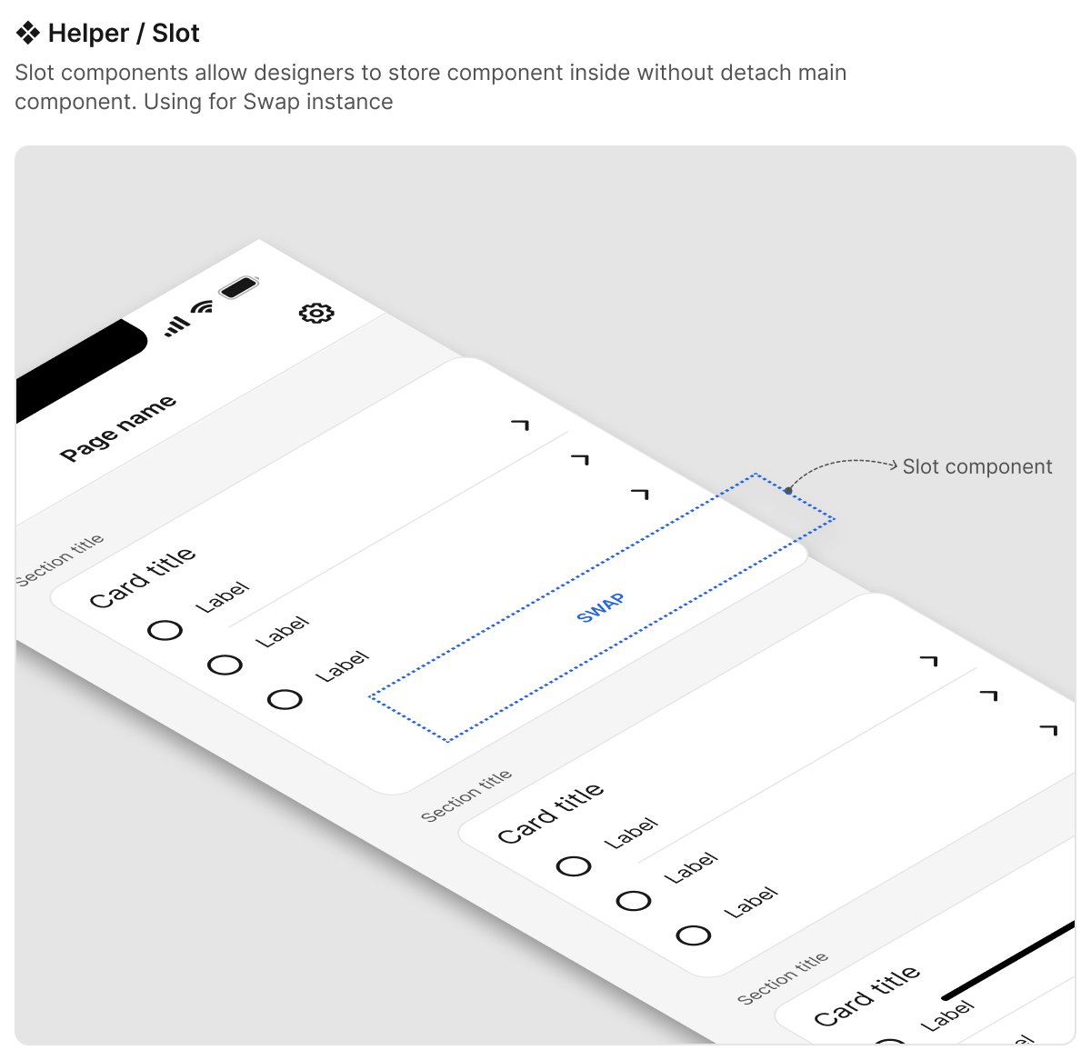 Creating the Slot component to solve the complex display case inside a component without detaching the master component, but it still follows the guidance I allow the Designer to swap it.